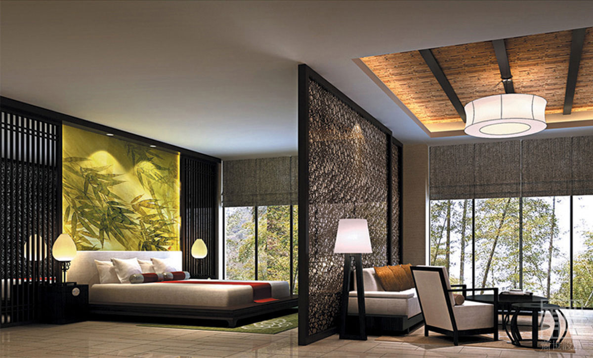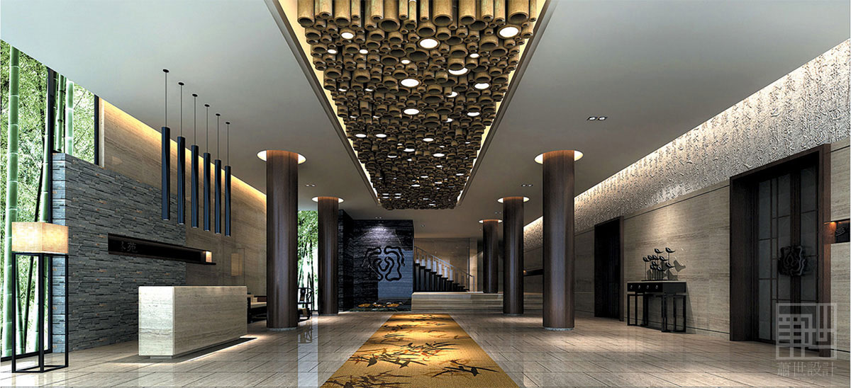墨苑總建筑面積約4960平米,由大堂、會議室及客房等組成。根據業主要求,結合當地地域特色文化,我們確立了以竹為主題,結合傳統書畫為設計的表現形式。著重傳達一種濃厚的文化氣息和休閑度假氣質,將竹的主題通過多種手法進行巧妙的演繹。大堂針對建筑原空間封閉的弱點,大膽將非承重墻局部敞開,與外部自然景觀形成對話。整個空間以《蘭亭序》為線索,通過天花的竹形成燈具和墻面的浮雕造型,著力體現《蘭亭序》中“崇山峻嶺,茂林修竹”、“群賢畢至,少長咸集”的意境。與建筑周邊環境(多山林修竹),使功能(會議)高度契合并使空間性格獨具一格。會議室根據面積大小和功能細分分別命名,大會議室為天朗,著重體現空間的開敞感和《蘭亭序》中“天朗氣清”的氛圍;中型會議室以“流觴”為主題,體現交流的樂趣;小會議室命名為“惠風”,主要針對空間封閉的弱點用較輕松的手法予人以休閑感。客房通過對原空間流線的重新梳理,套間普遍增大了衛生間的使用面積,使客房品質感得以極大提升。在設計語匯的使用上以新中式為主,在休閑舒適的前提下著力營造傳統書畫的藝術意境,主要構想以“竹”為主題,貫穿各樓層,通過地毯、墻紙等軟裝傳遞“墨竹、朱竹、雪竹”等多種竹文化意象。讓旅客在舒適的環境中感受傳統文化的熏陶。