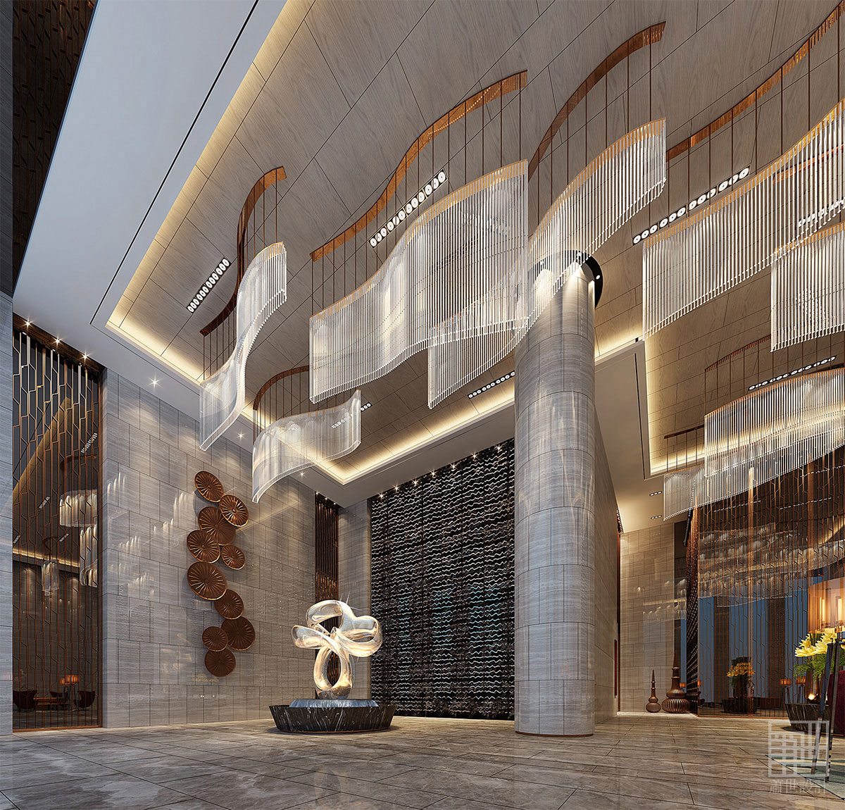 水清澈、通透、晶瑩,它是萬物的生命之源 。水能生財,湖能聚財,這一傳統(tǒng)風(fēng)水理論,給本案帶來居多思想源泉。水可千變?nèi)f化,也可平如鏡面。設(shè)計師把波光粼粼、碧波漣漪、水波、水花等幾個水的常見形態(tài)用來作為設(shè)計元素的分形與提煉,把與水有關(guān)的形態(tài)語言巧妙的運用到空間設(shè)計上。設(shè)計師從一開始就注重了水的連貫性,首先從酒店主入口著手,采用圓形的噴泉作為過往車道的中軸景觀,再到大堂中心的水帶造型雕塑,使其作為酒店主要軸線。從外到內(nèi)以水為引導(dǎo)方式來聚齊八方客。