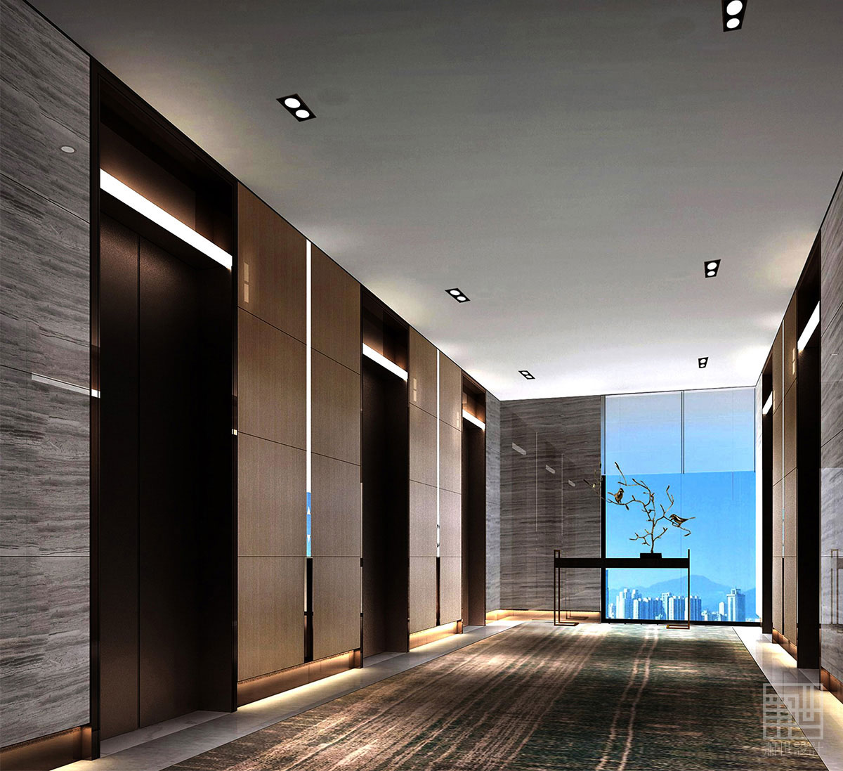 由于一層電梯間空間無自然采光的弊端,設(shè)計師巧妙的運用了以湖面景色的畫卷作為空間背景的延續(xù),把銅制的飛鳥作為端景雕塑構(gòu)建虛實變化來襯托空間的靈動。同時,客人在等候電梯時,也能將其帶入這片美麗的湖色畫卷之中。