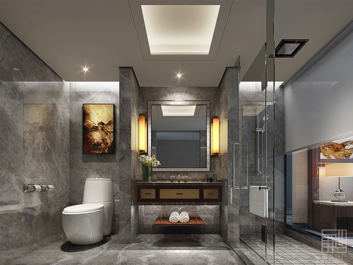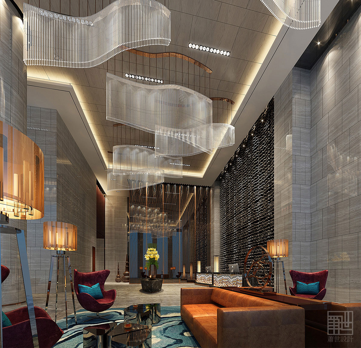 酒店大堂的空間本身方正且不規(guī)則,故沒有刻意去強調(diào)空間的對稱性,所以通過以“水”來以柔克剛來展現(xiàn)其自然柔和形態(tài),依次呼應(yīng)整個空間設(shè)計。在中國古代,九為陽數(shù)的極數(shù),即單數(shù)最大的數(shù),借此大堂吊頂采用了九盞水波形態(tài)的水晶吊燈設(shè)計,以九五之尊來闡釋對客戶尊貴。