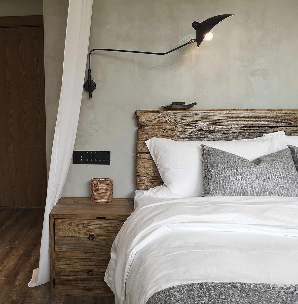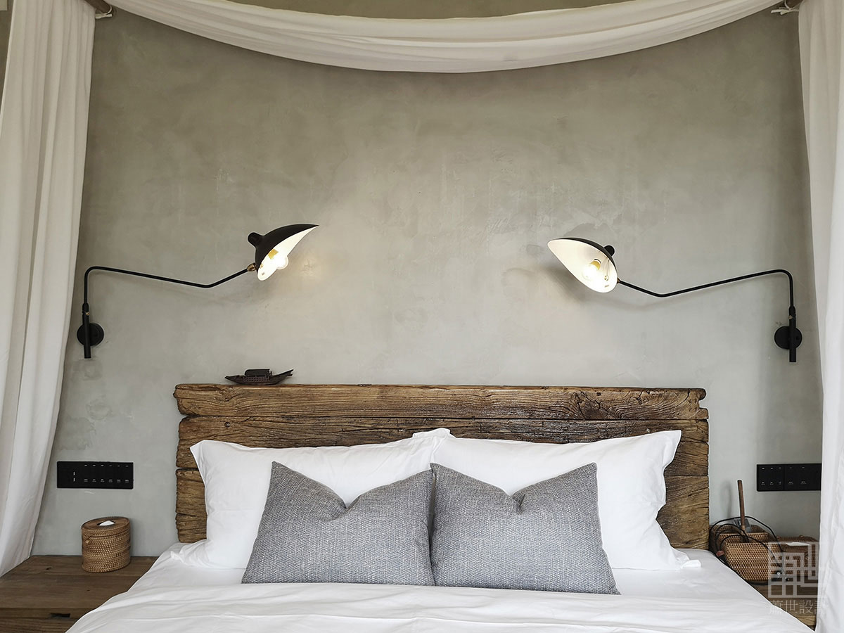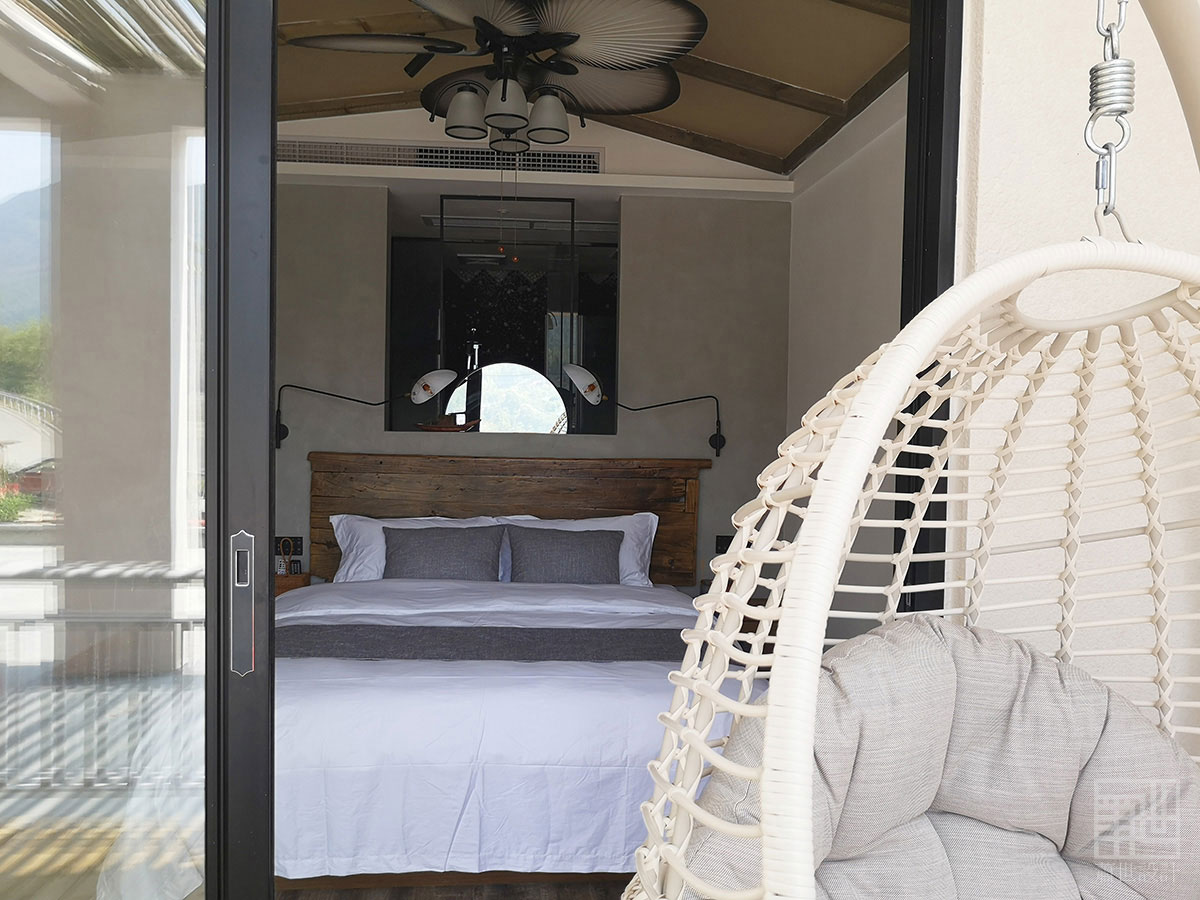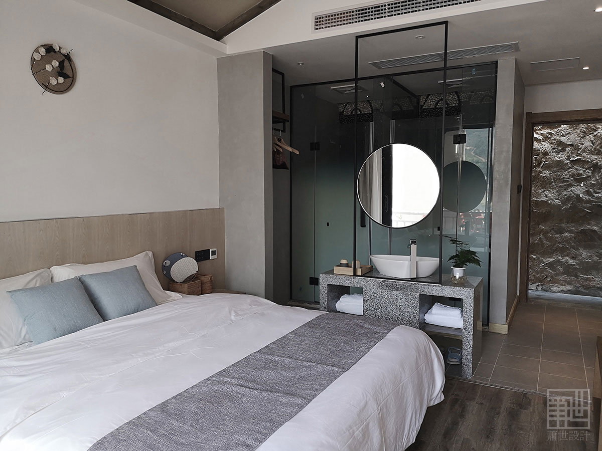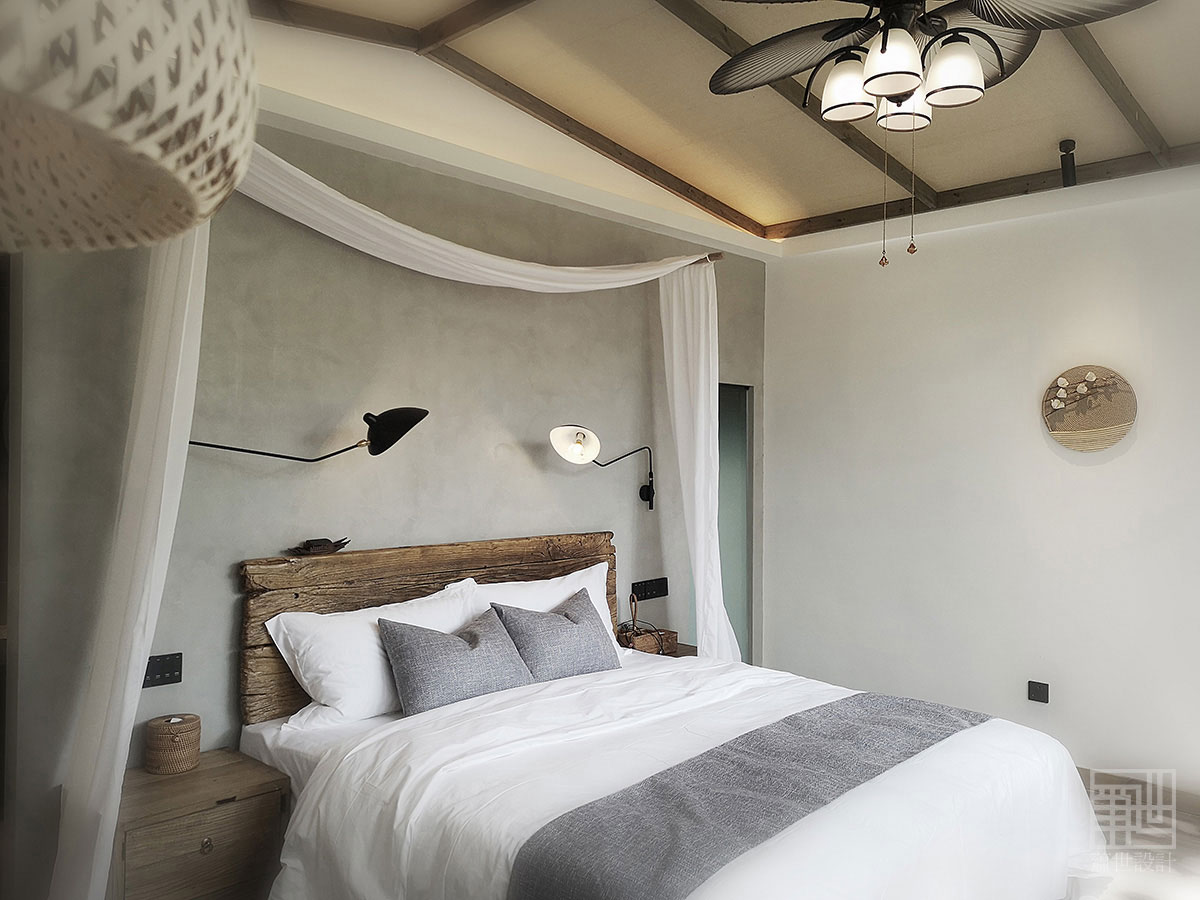 室內空間運用了當地傳統民居常用石料、木作、素水泥為主,石與木的自然紋理及質地,帶給現代人內心的情感仍然揮之不去。原石木就地取材,放棄精細加工,質樸的天然材料搭配精致的人工手作家具,在陽光或燈光的映襯下,粗礦中不乏精致和細膩。軟裝部分整個空間質樸典雅,灰色的沙發、麻料布藝、藤編、紗簾等...... 讓情境回歸変得如此的純粹,讓生活回歸它原有的樣子,讓每一位家人感受自然的樂趣,呼吸人間煙火的氣息。