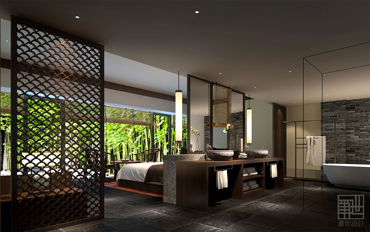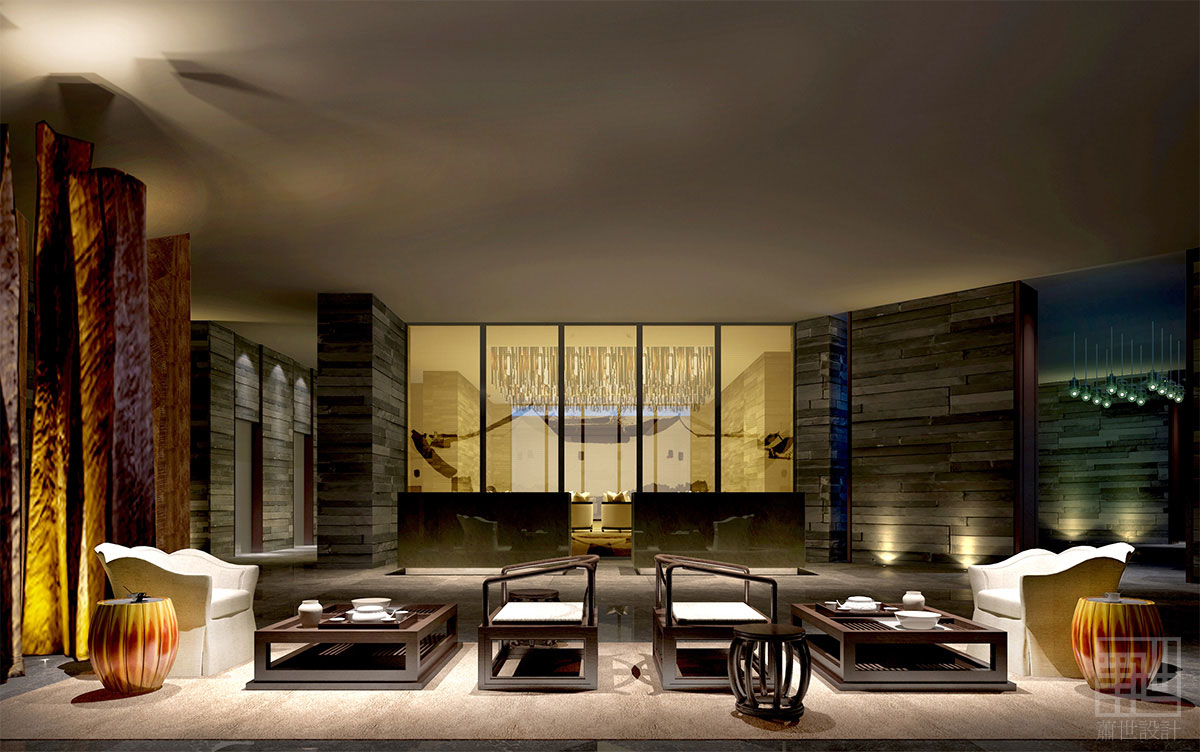 通過空間的收與放、圍與合像蘇州園林中的先抑后揚的手法運用在空間形態中。并且融合現代生活的設計觀念:以四個字來貫穿整體空間 - 清、雅、樸、華。